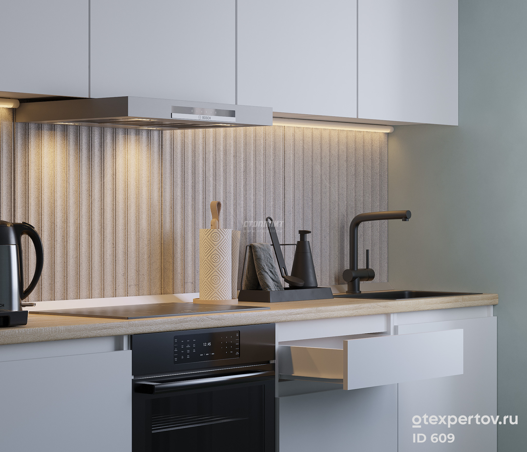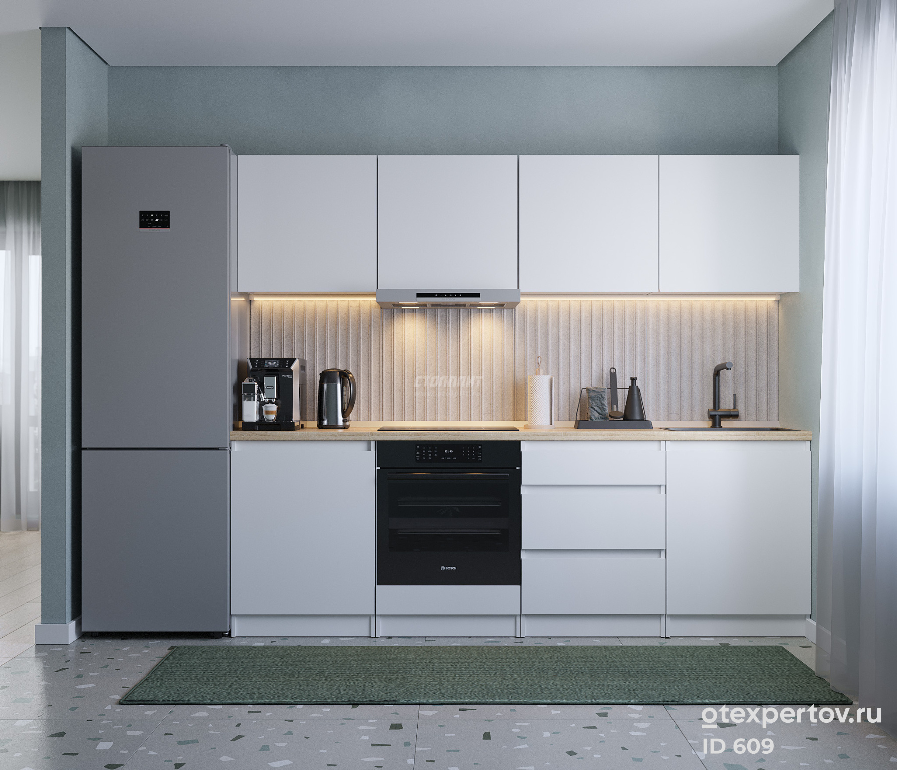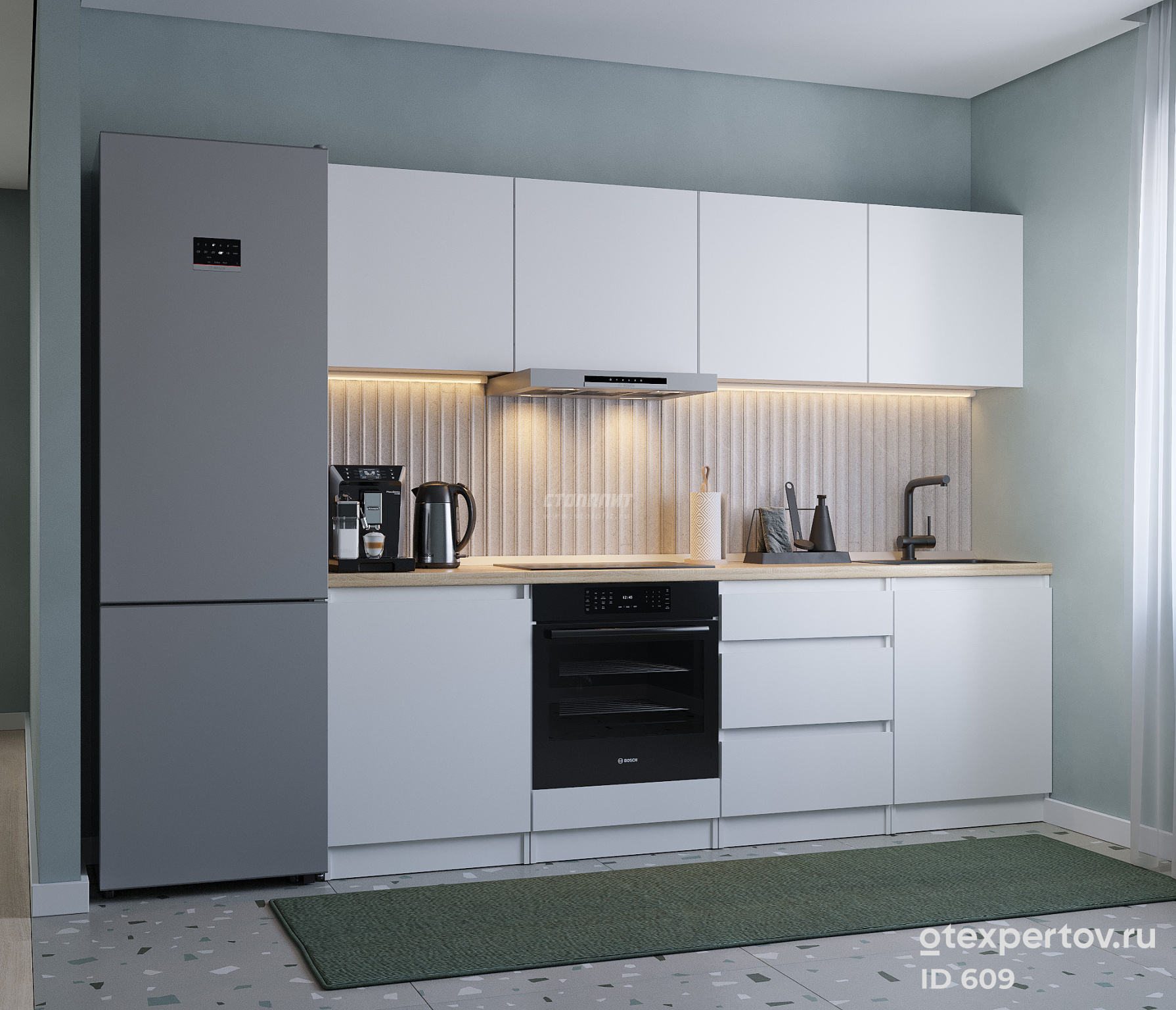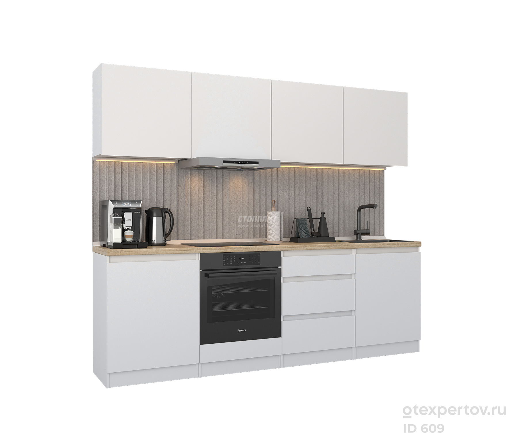 Стоимость кухонного гарнитура, прямая, 2.4 метра, с навесными ящиками, фасады из белого ЛДСП, без ручек.