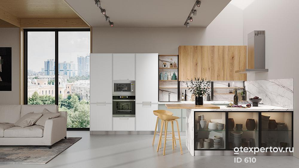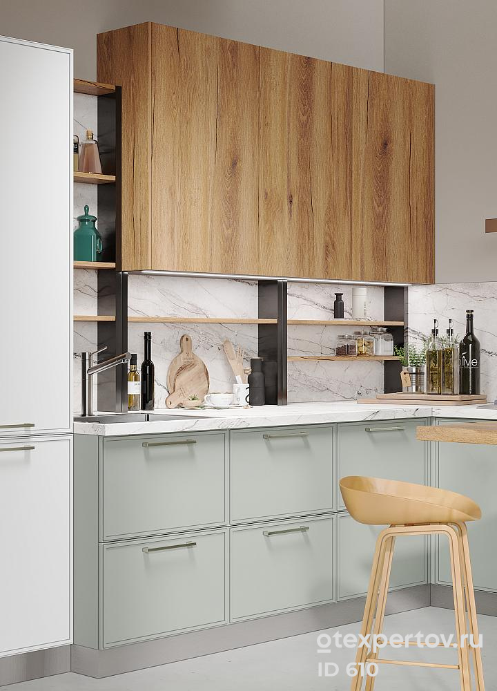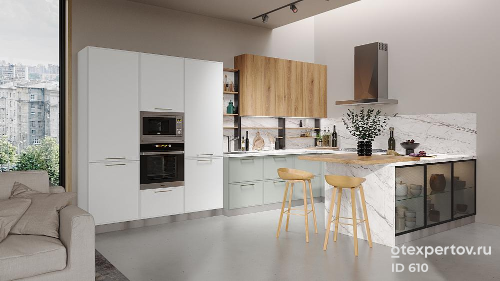 Стоимость кухонного гарнитура, угловой, 6 метров, фасады МДФ в эмали, влагостойкая столешница «Aqua Green», с системой выдвижных ящиков.