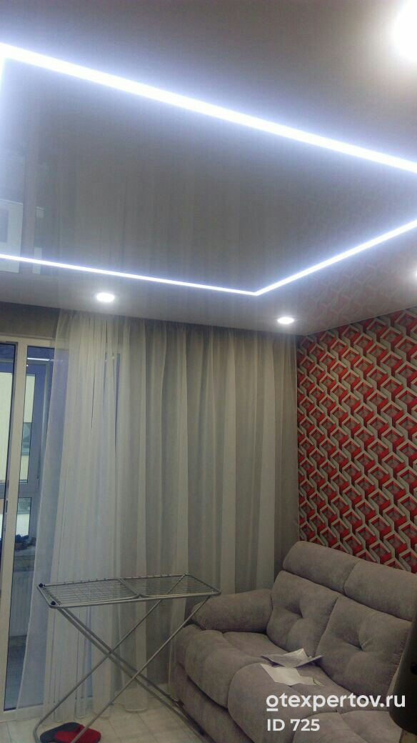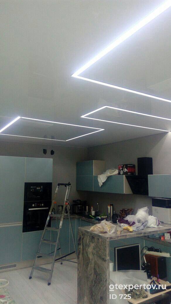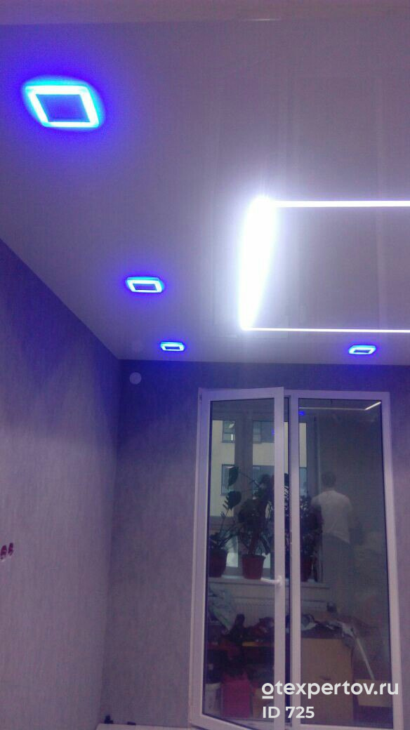Глянцевые натяжные потолки 57 м2, с подключением световых приборов и электроразводкой